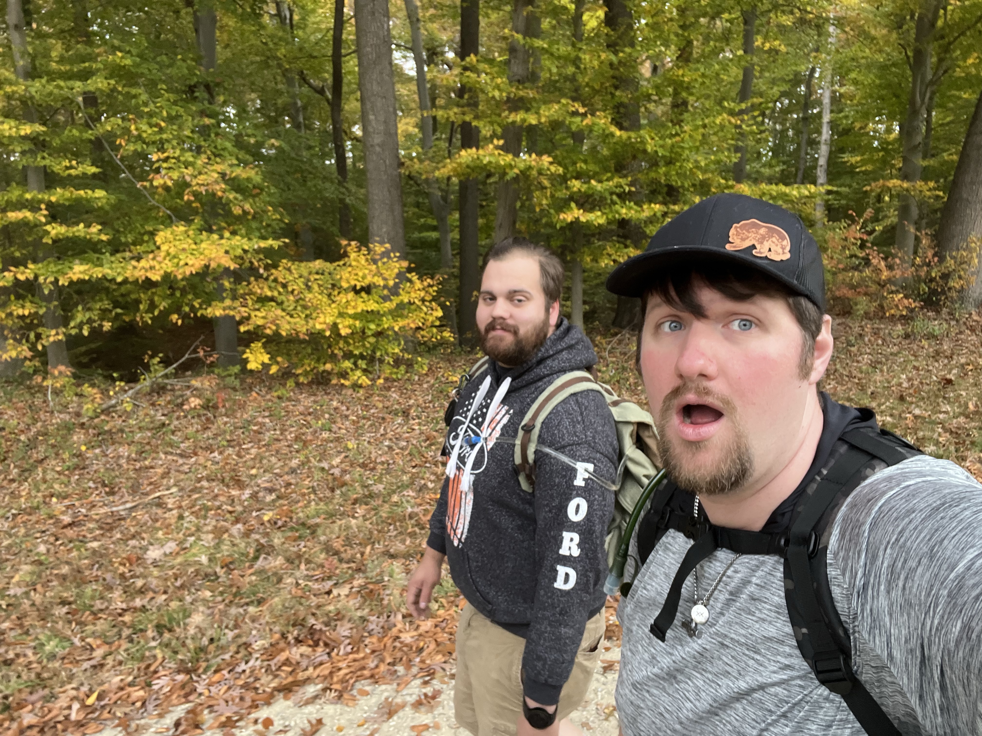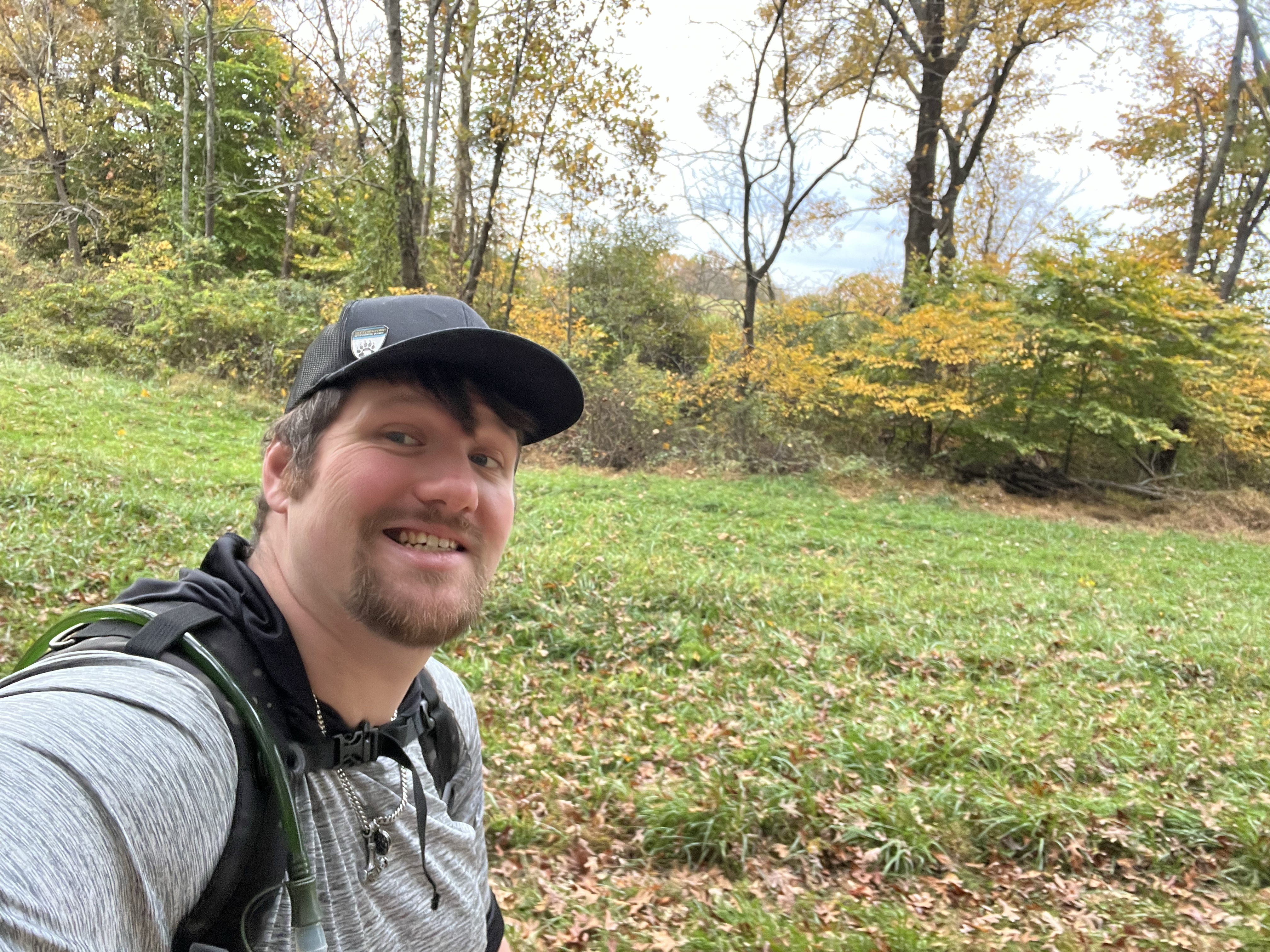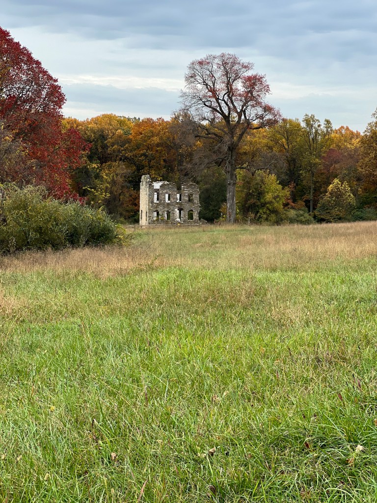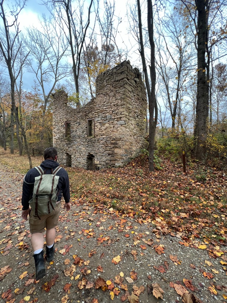 One of the first great features of this trail was a view of some of the old ruins found around Fair Hill. Given that it is the spooky time of year, these were awesome to see with the fall leaves all around them. As you can see Nick was zooming to get over there to see them. This is one of two ruins we got to see on this hike. The other is called the “Willis House” and was later in the trail. I will include a picture of that one in the gallery below.