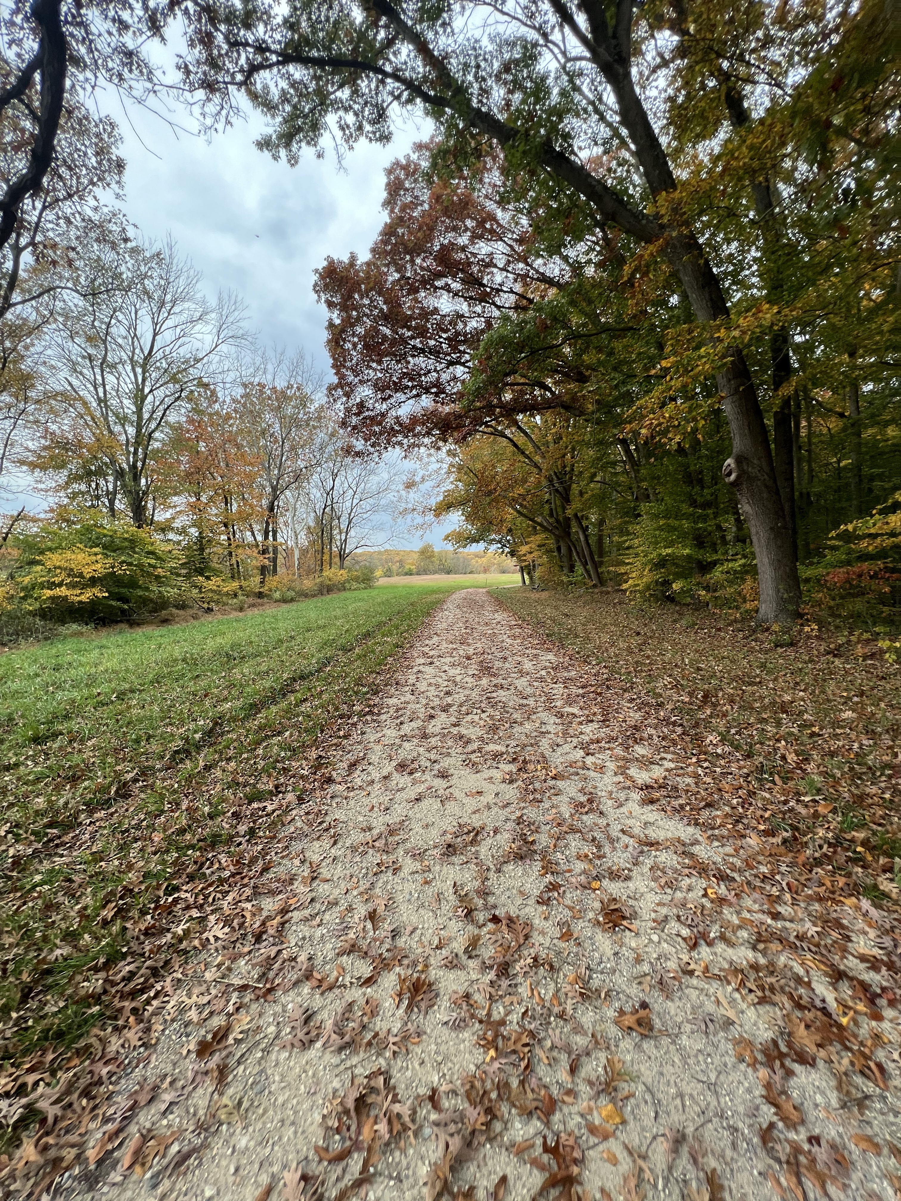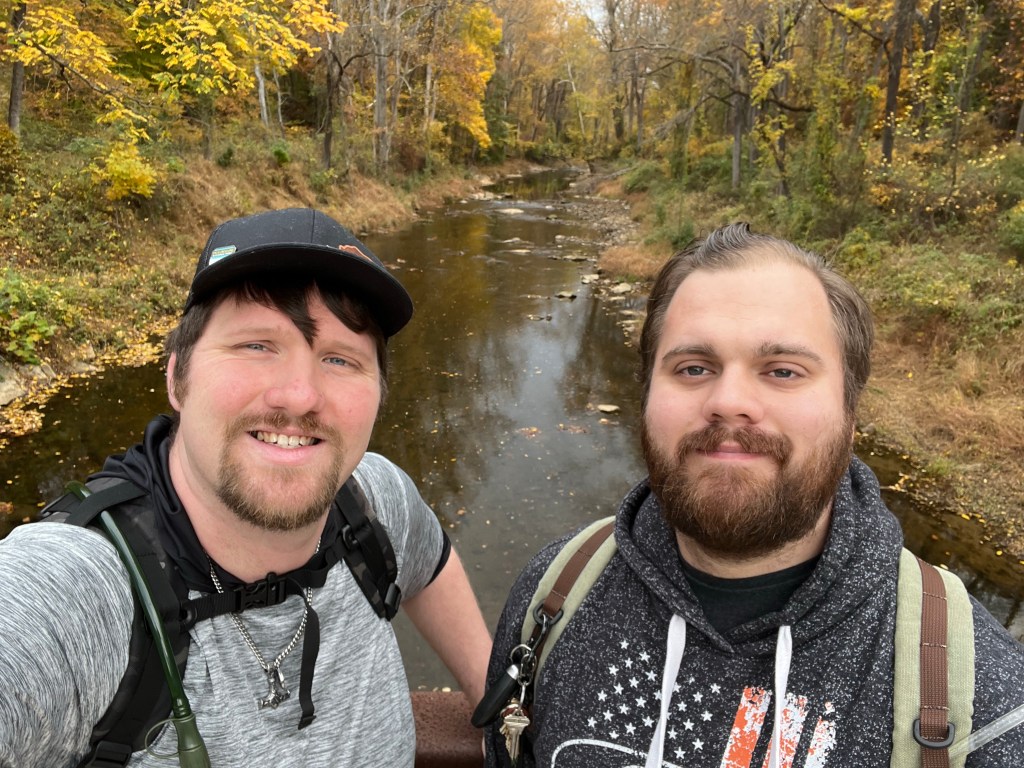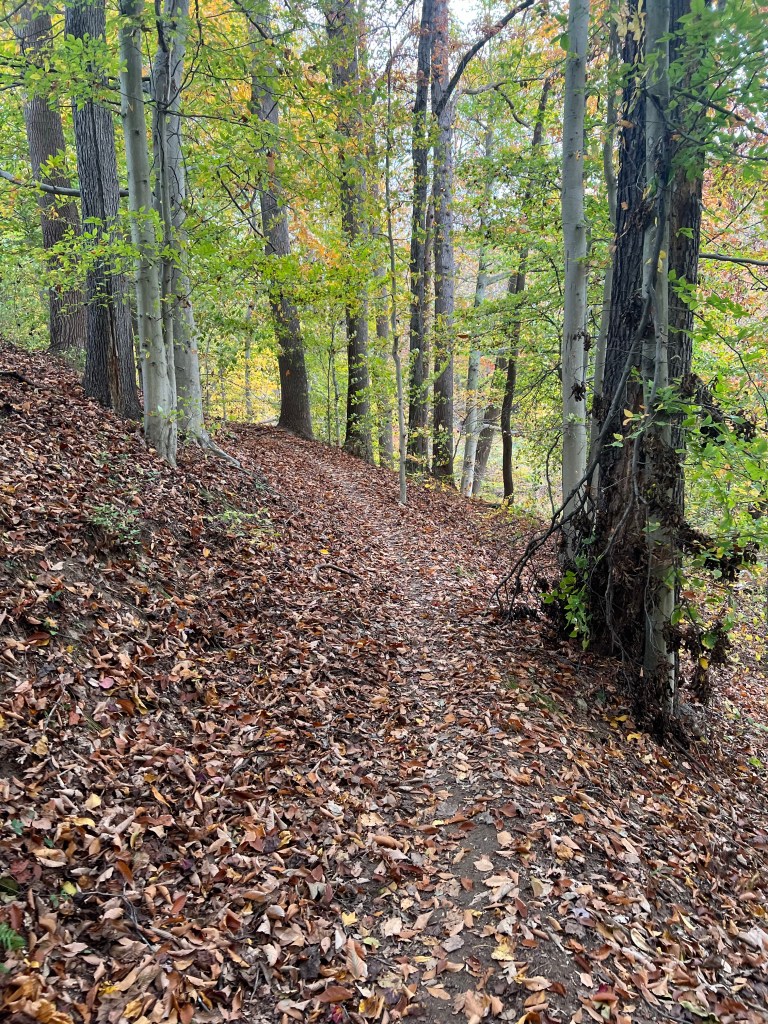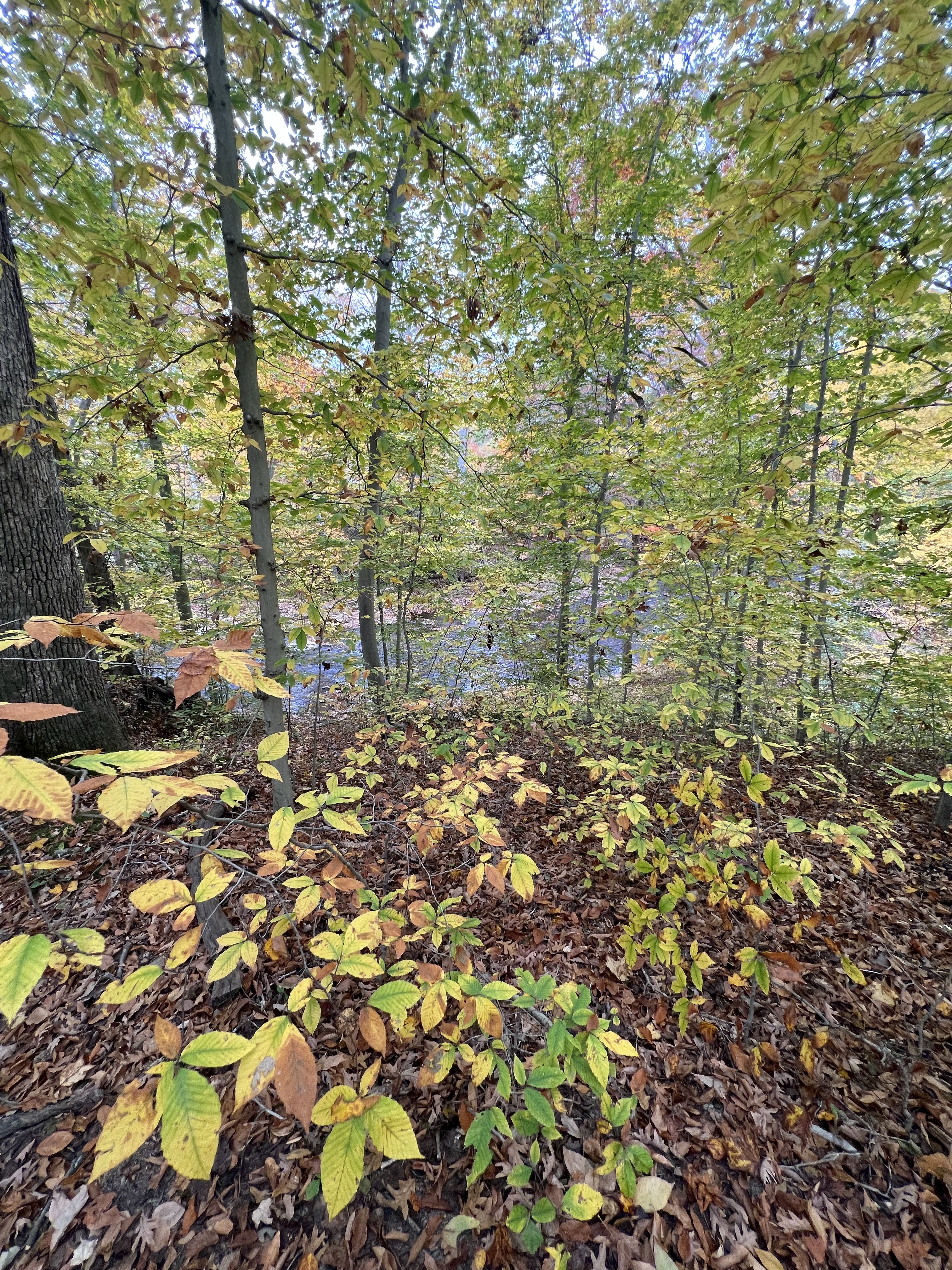 One of the first great features of this trail was a view of some of the old ruins found around Fair Hill. Given that it is the spooky time of year, these were awesome to see with the fall leaves all around them. As you can see Nick was zooming to get over there to see them. This is one of two ruins we got to see on this hike. The other is called the “Willis House” and was later in the trail. I will include a picture of that one in the gallery below.