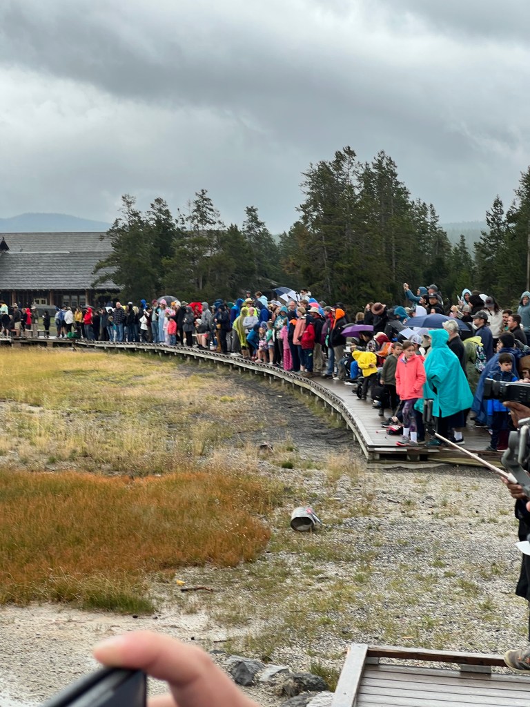 Next, keep in mind that there is two types of experiences in Yellowstone National Park: Front Country and Back Country. It is important to know the difference. This crowd here is from when we were waiting for Old Faithful. Keep in mind that if you are doing Front Country experiences like this, crowds will be there for sure. Everyone wants to see these wonders. Make sure to get an early start if you want a good look and beat the crowds. As for the back country, keep in mind it is safest to travel in groups of 3 or more, so Nick and I didn’t do much there this trip. Make sure to plan backcountry excursions and check in at a backcountry ranger station for permits and planning before you go!