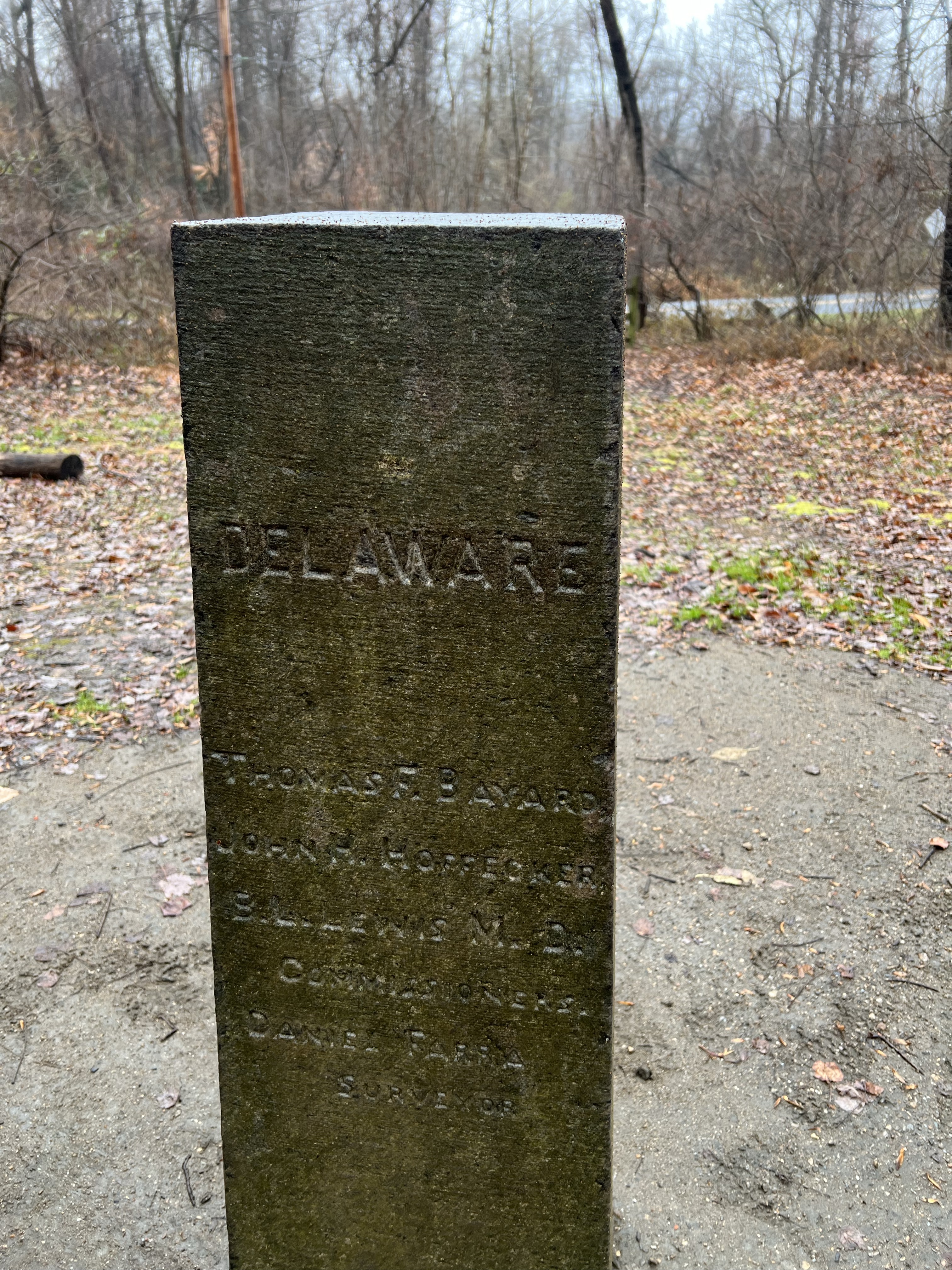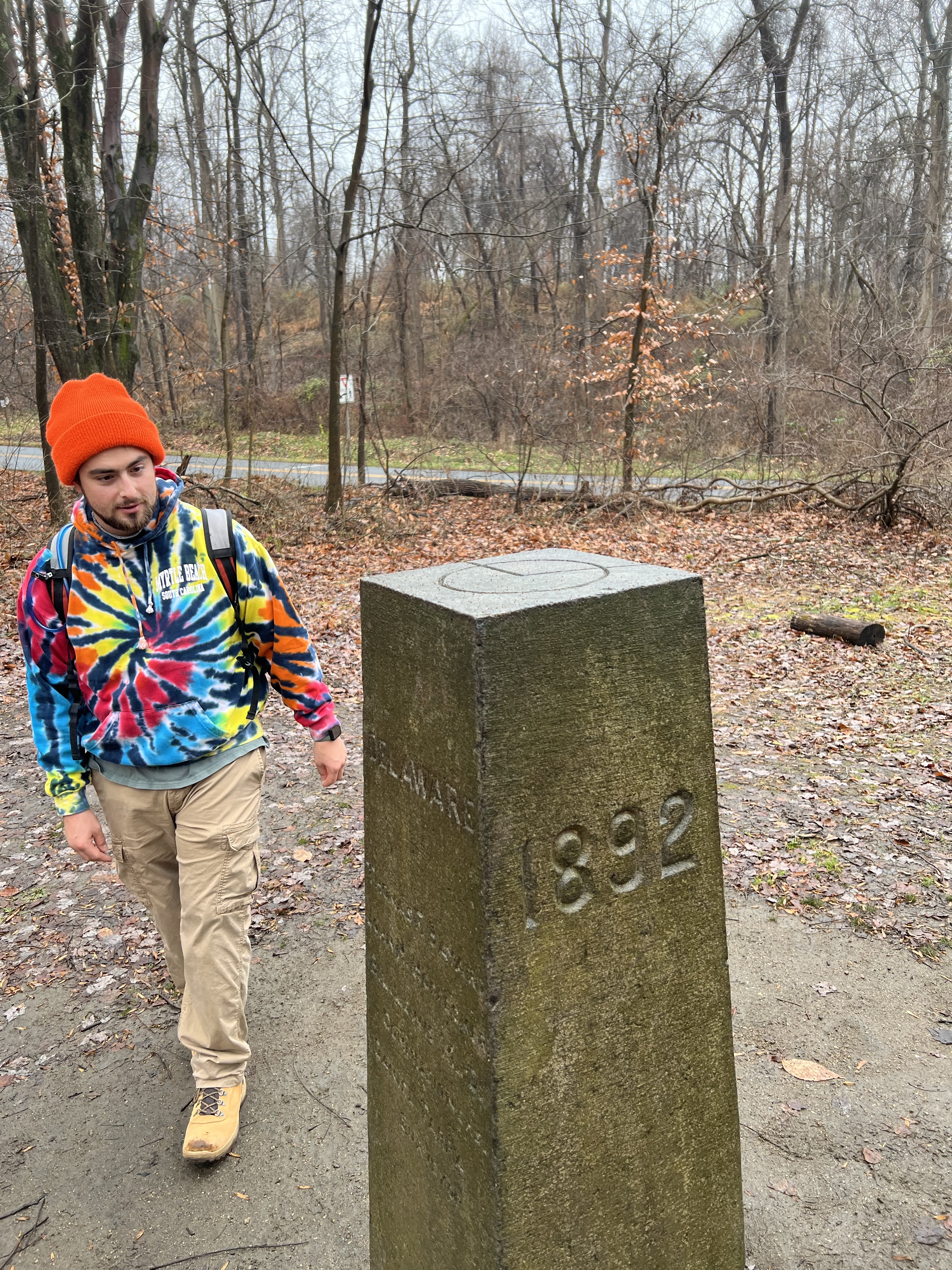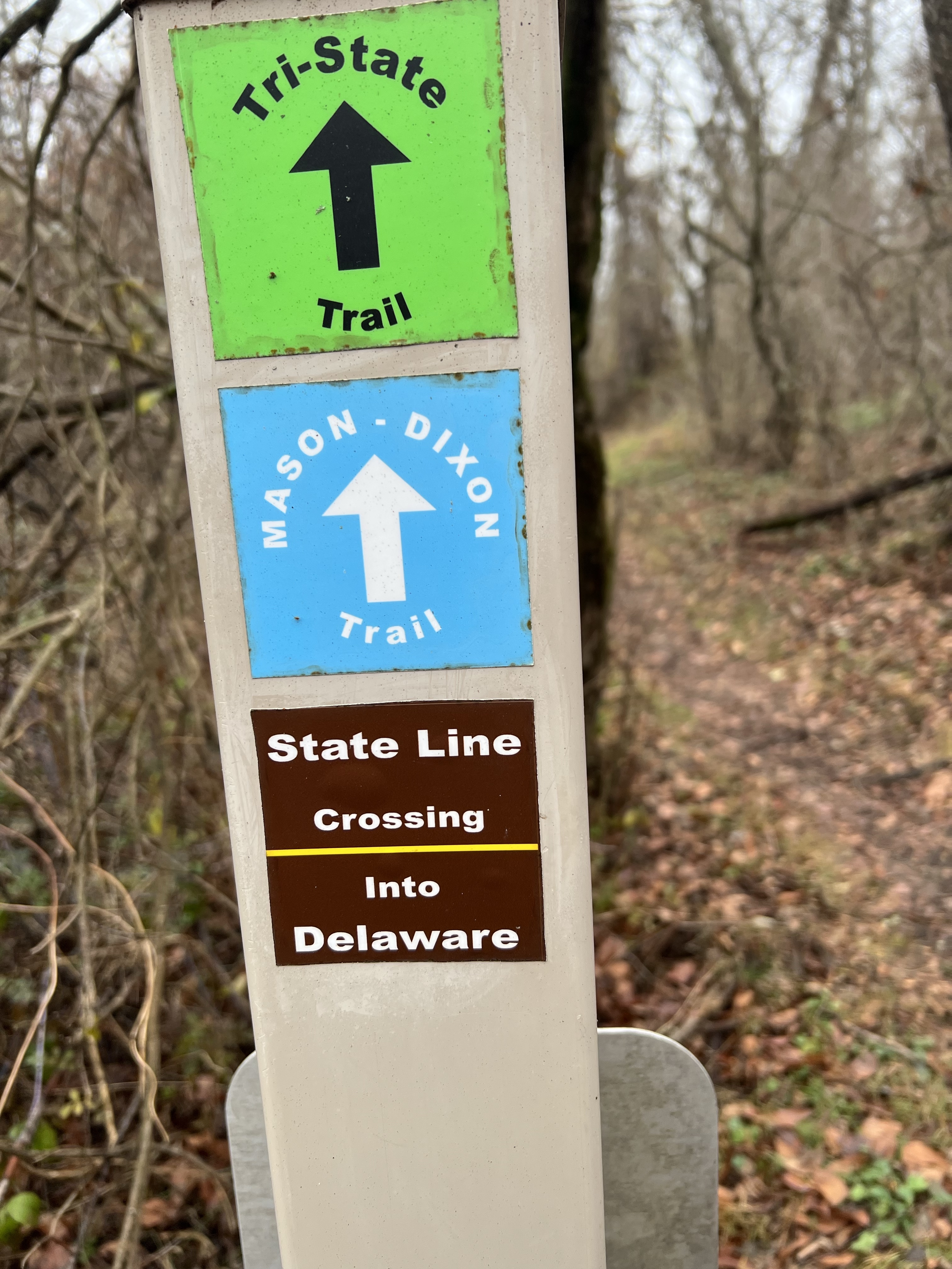 We left from the Nature Center located off of Hopkins Road. Like the Tri-State Marker trail, this trail also came with a cool monument. This one was for the arc shaped border that Delaware shares with Pennsylvania. It even comes with a fun dial on the top to tell you where the border runs, so you can hop between each state. You will have to ignore the intense side eye that Seningen is giving in this picture, I promise it was meant for me, not you.