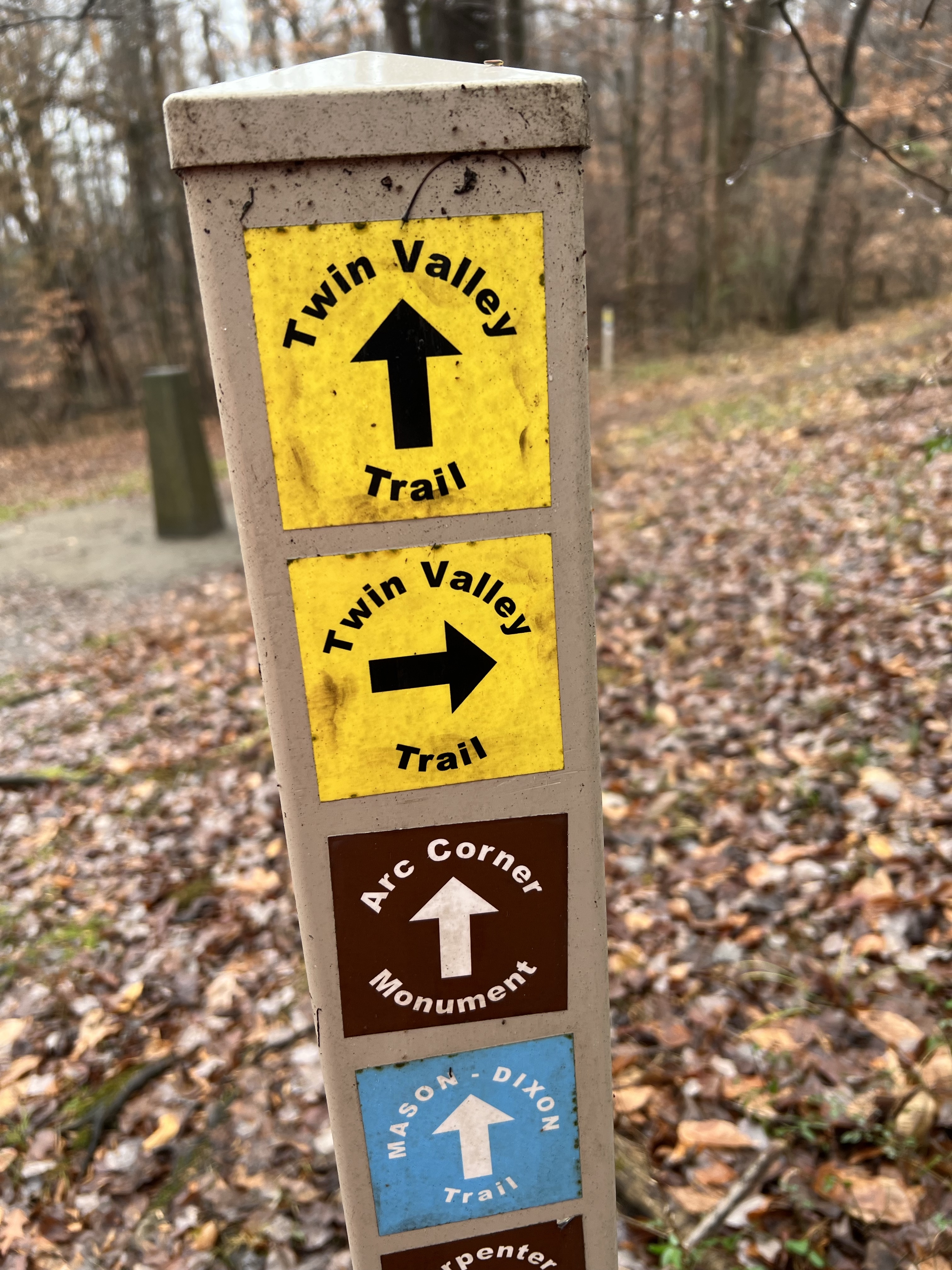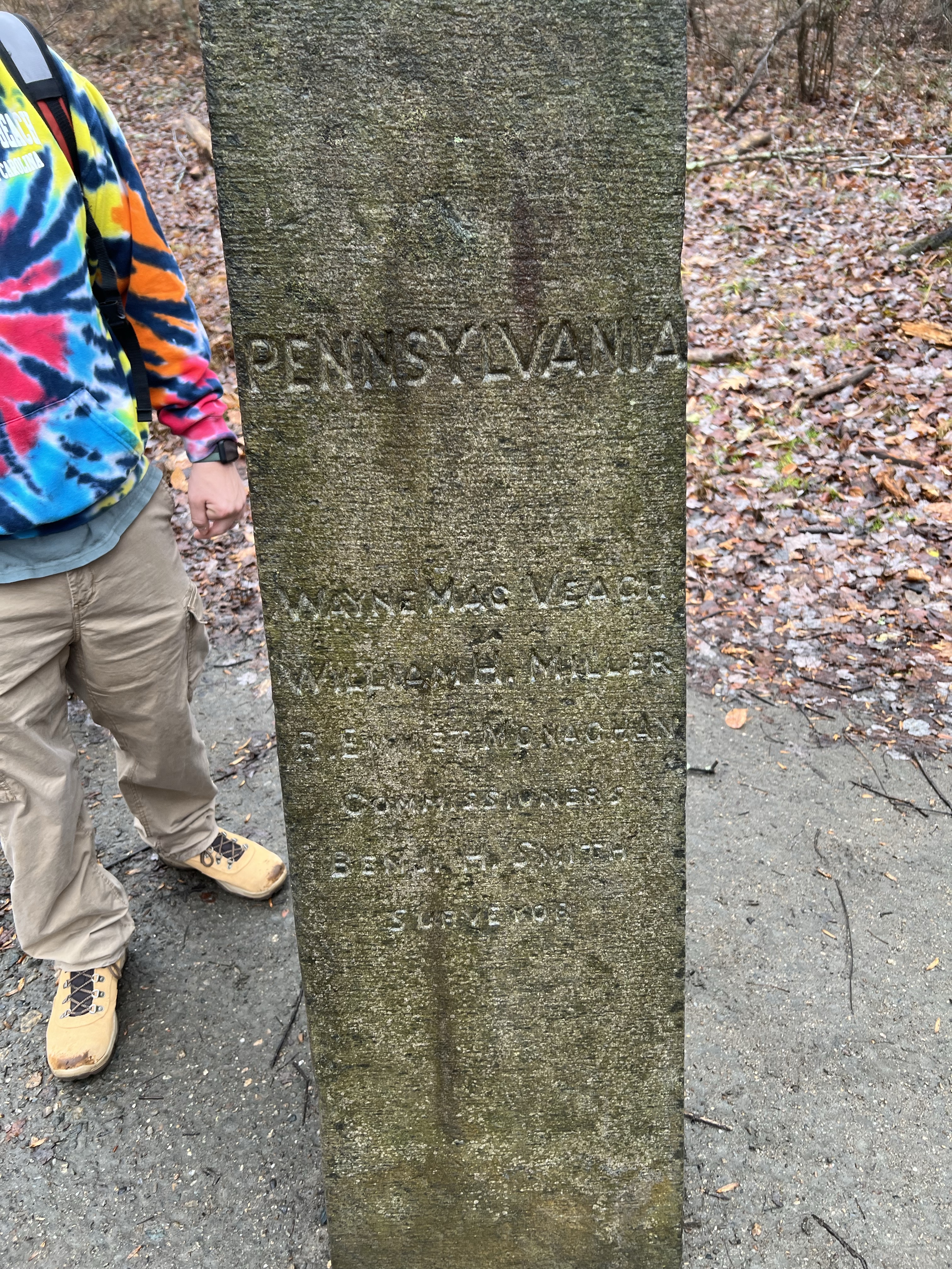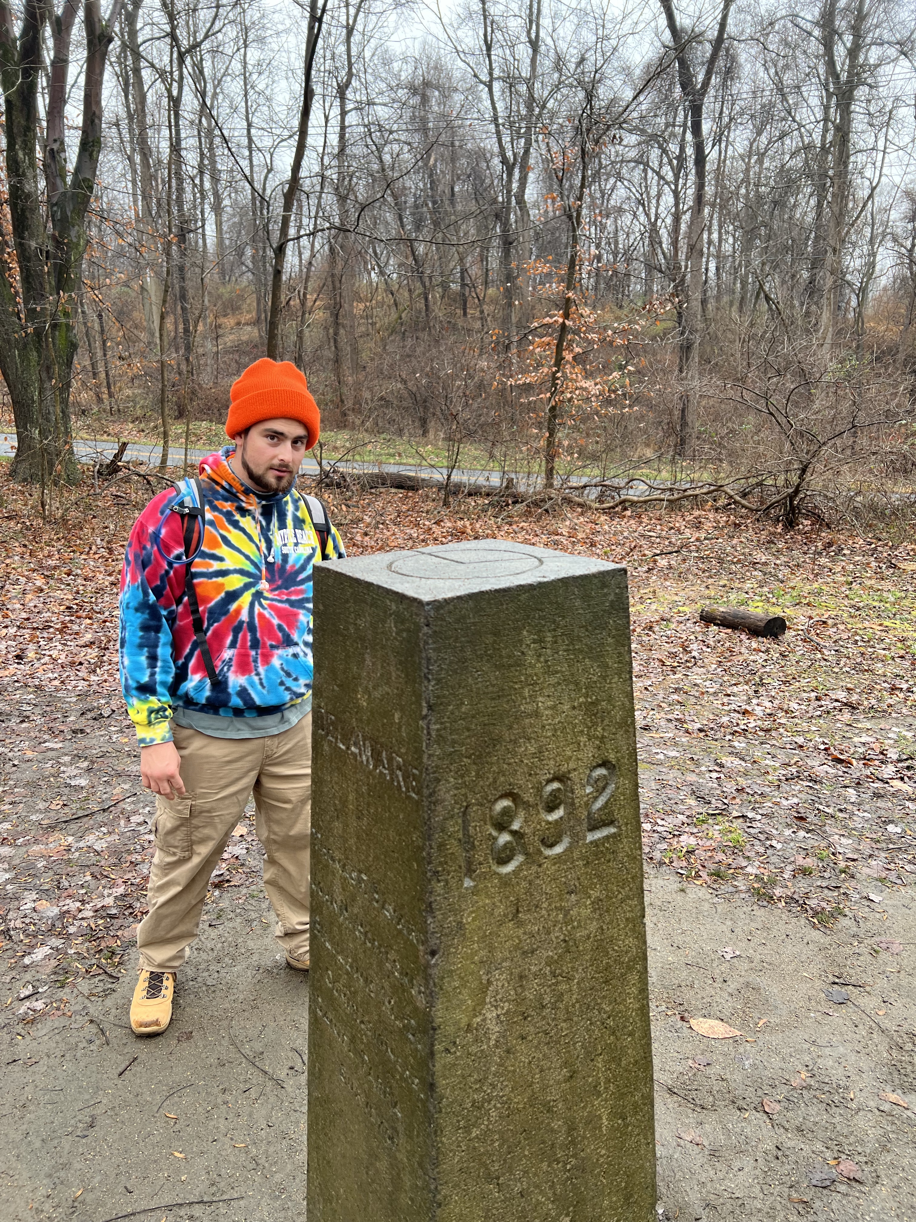 We left from the Nature Center located off of Hopkins Road. Like the Tri-State Marker trail, this trail also came with a cool monument. This one was for the arc shaped border that Delaware shares with Pennsylvania. It even comes with a fun dial on the top to tell you where the border runs, so you can hop between each state. You will have to ignore the intense side eye that Seningen is giving in this picture, I promise it was meant for me, not you.