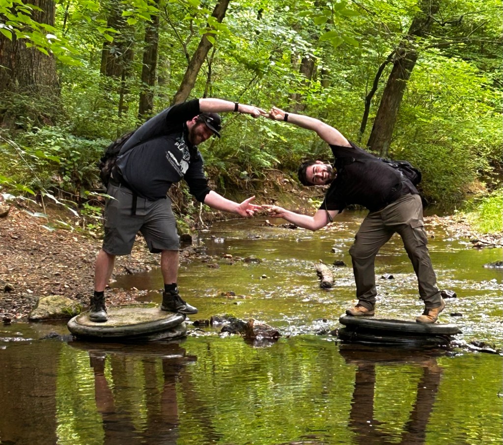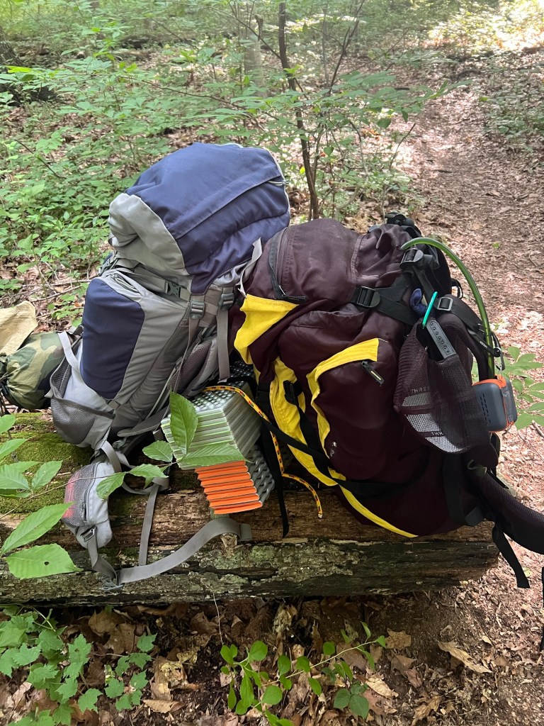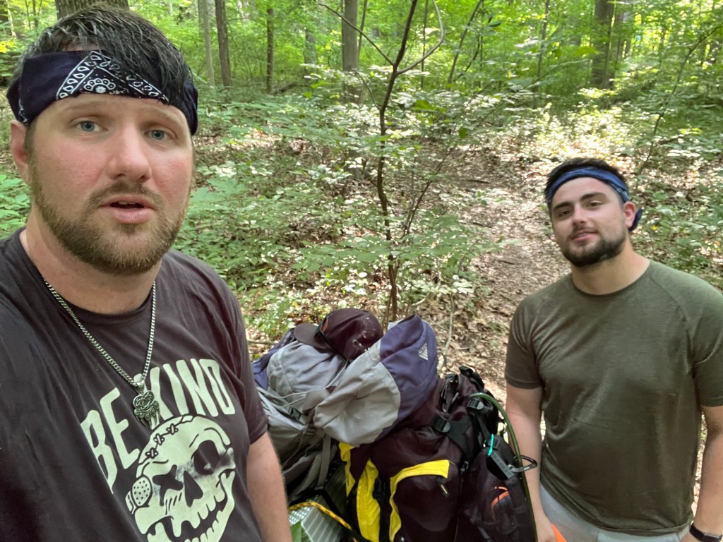 Finally we did ALL of our gear, food, clothes, AND the weight plates. We cursed our past selves for the plan and determined what cruel things we would do to our past selves if ever time machines were invented. That was HEAVY. We did the tri-state trail at White Clay Creek State Park. Here we are sweat covered, and sitting with a back to back with a cheek in each of three states. (We are sitting on the Tri-State line between PA, MD, and DE)
